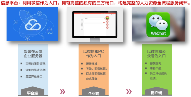 利用微信作为入口,拥有完整的独有的三方端口,构建完整的人力资源全流程服务闭环。轻松实现移动办公、企业社交、信息发布等协同功能。